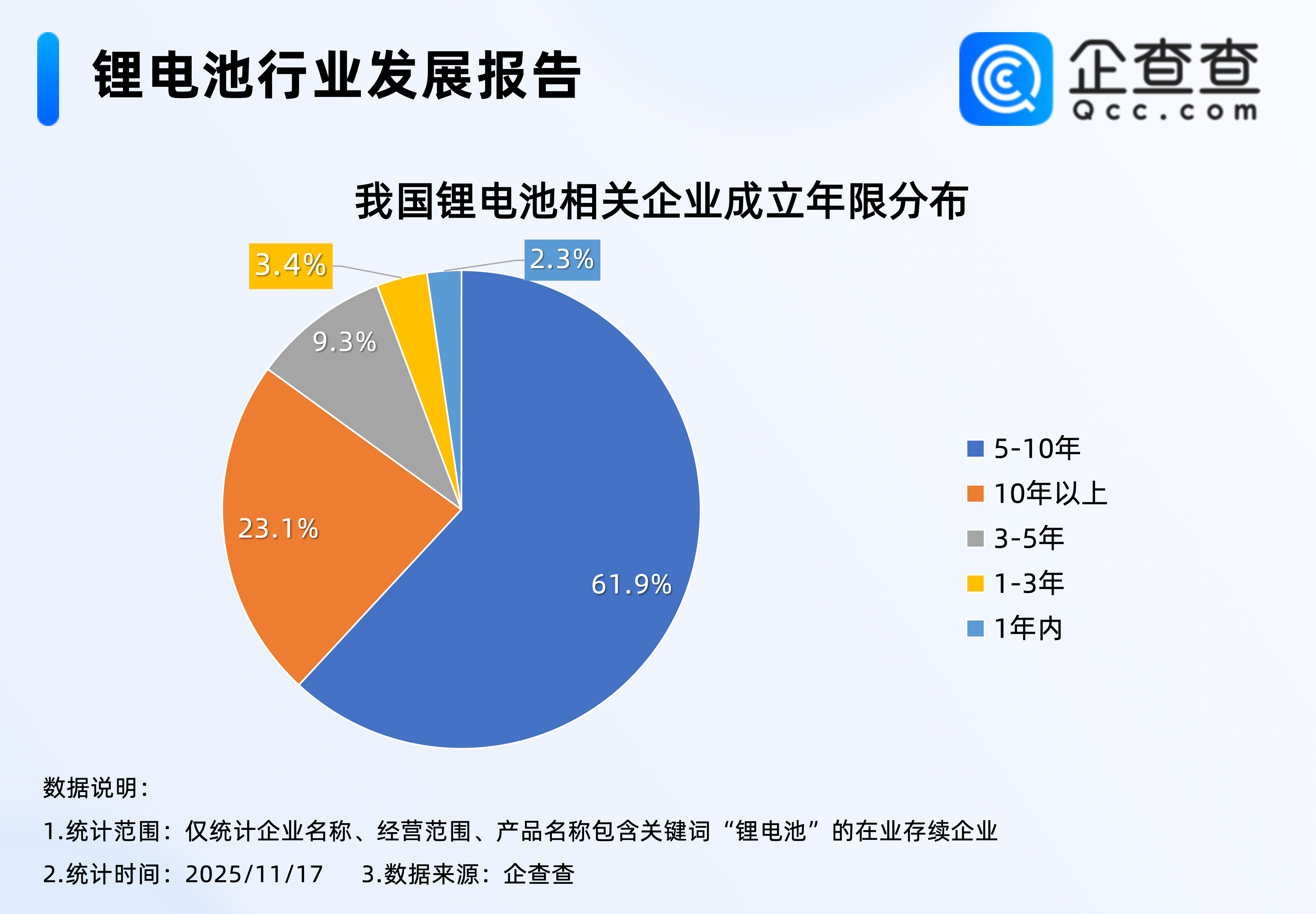 企查查数据显示,截至11月17日,我国现存1.7万家锂电池相关企业,区域分布上,华南地区最多,占比40.6%,其次是华东地区,占比31.5%,西北地区相对最少,占比2.8%。3.从成立年限来看:成立10年以上的企业占比23.1%